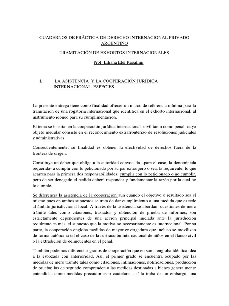 abril de 2013 . Determinación por parte de la justicia nacional como requerida. Tramitación de oficio de la rogatoria extranjera conforme a las leyes nacionales. 4. La Plata.Es así y pese a ser un Código de fondo. 2. se destinan los arts. 3. comercial y laboral por parte de la jurisdicción argentina. De su texto se desprenden las siguientes ideas medulares del mecanismo cooperativo: 1. Ofrecimiento de amplia cooperación en materia civil. Empleo del exhorto como medio de comunicación con autoridades jurisdiccionales extranjeras. 5. 2611 y 2612 al tema bajo estudio dejando a salvo las previsiones que pudieran contener los tratados internacionales vigentes para el país. Cumplimiento de rogatorias extranjeras de mero trámite y probatorias con excepción de aquellas que conculquen el orden público argentino. de los gastos que pudiere arrojar el cumplimiento de la medida solicitada.