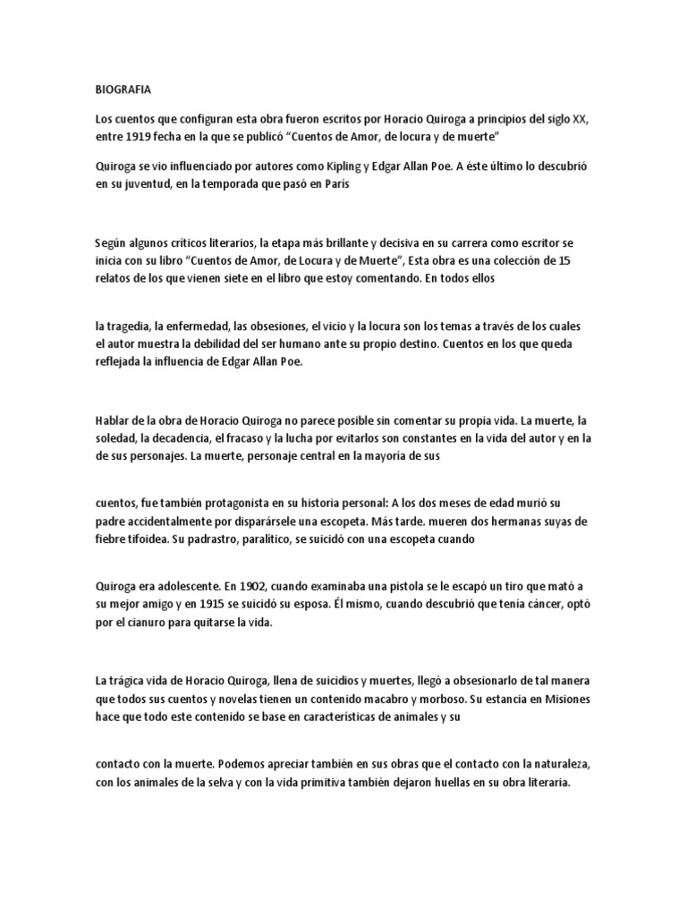 que todos sus cuentos y novelas tienen un contenido macabro y morboso. Su estancia en Misiones