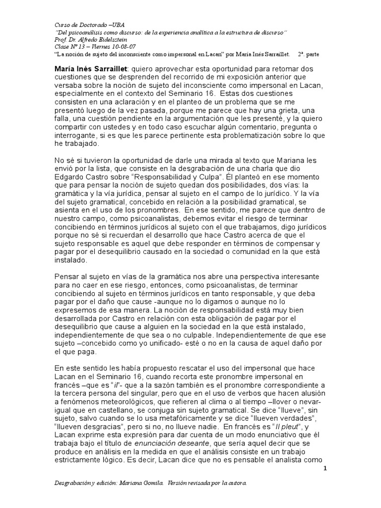 “La noción de sujeto del inconsciente como impersonal en Lacan” por María Inés Sarraillet. 2ª. parte