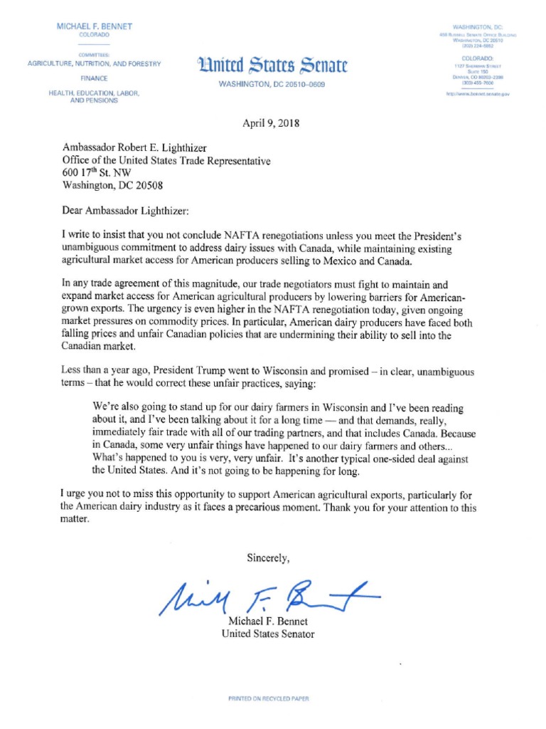 Colorado U.S. Senator Michael Bennet sent a letter to U.S. Trade Representative Robert Lighthizer, insisting that dairy issues with Canada are addressed in the NAFTA renegotiations, while ma…Descripción completa