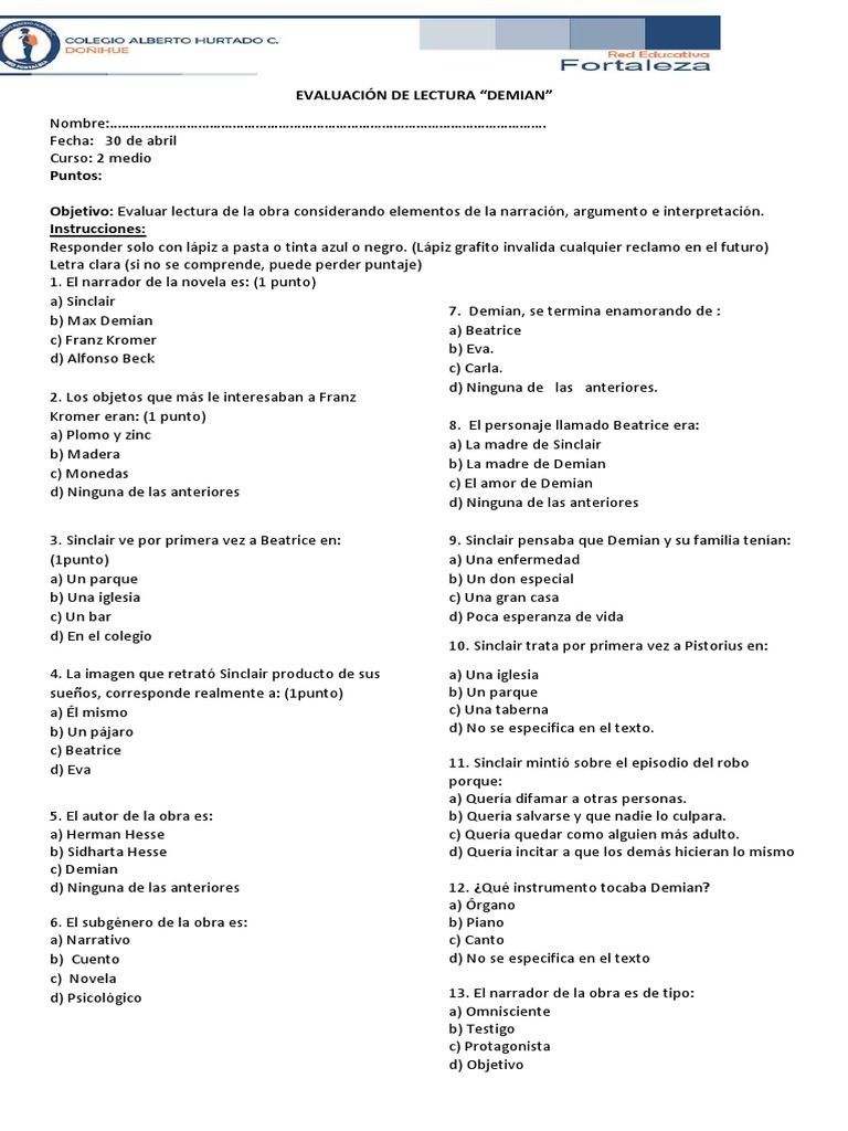 EVALUACIÓN DE LECTURA “DEMIAN”