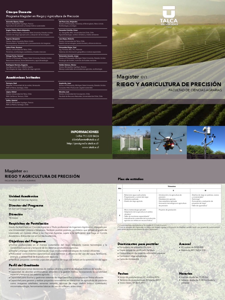 • Diseñar y manejar distintos sistemas de riego involucrando estrategias de manejo eficientes. • Copia simple de certificado de título • Matrícula 2017 $254.318