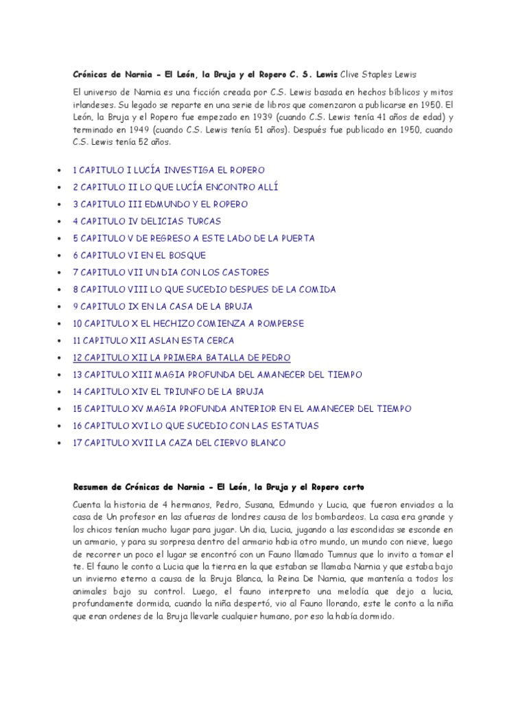 Resumen de Crónicas de Narnia - El León, la Bruja y el Ropero corto