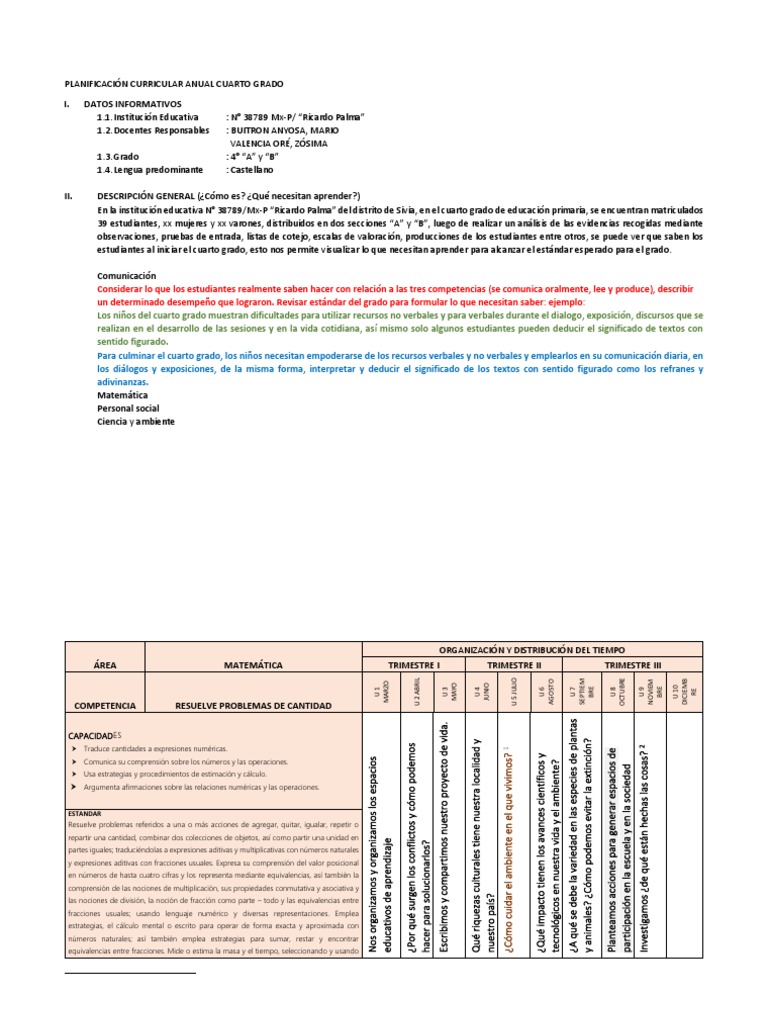 Planificación Curricular Anual Cuarto Grado