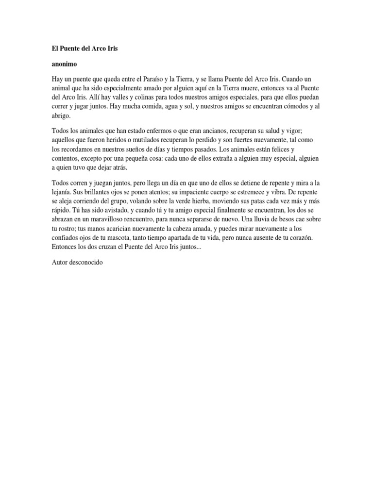 Hay un puente que queda entre el Paraíso y la Tierra, y se llama Puente del Arco Iris. Cuando un