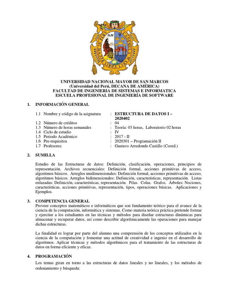 1.1 Nombre y código de la asignatura : ESTRUCTURA DE DATOS I –