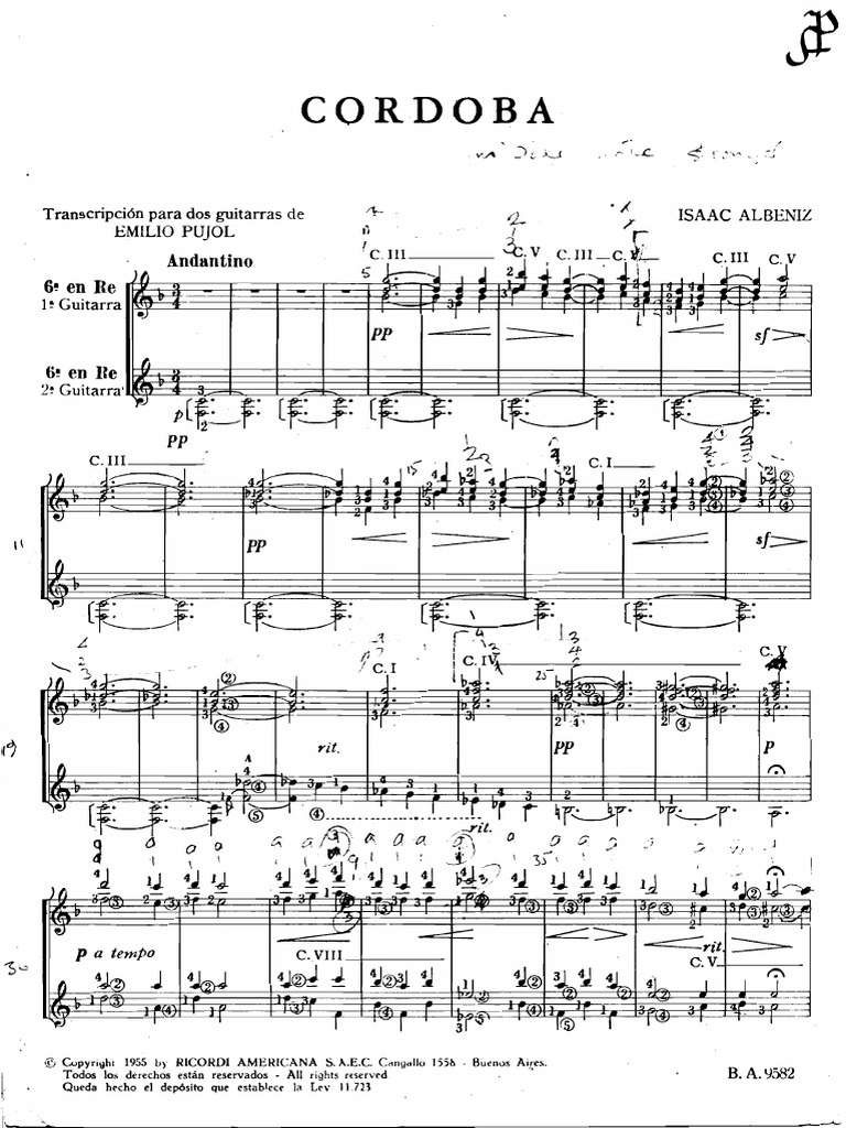 Arreglo de Emilio Pujol para dos guitarras del tema Córdoba de I. Albéniz