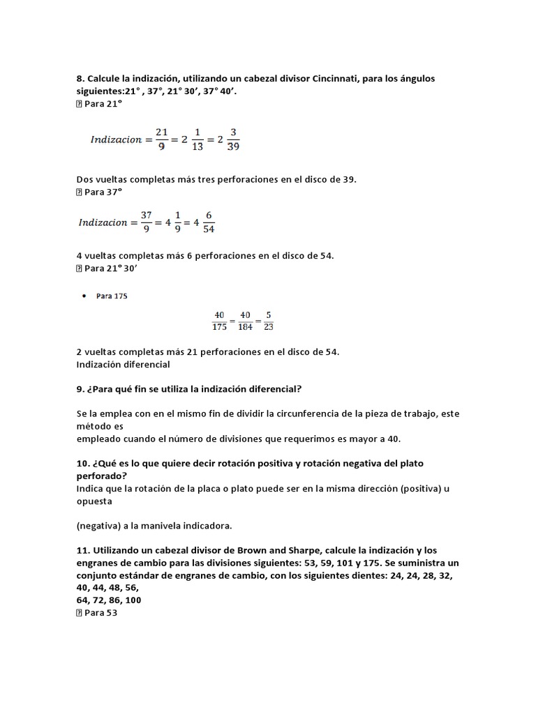 11. Utilizando un cabezal divisor de Brown and Sharpe, calcule la indización y los
