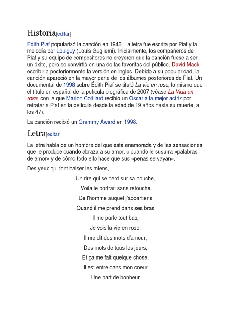 documental de 1998 sobre Édith Piaf se tituló La vie en rose, lo mismo que