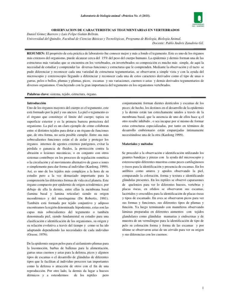 RESUMEN: El propósito de esta práctica de laboratorio fue conocer mejor y más a fondo el tegumento. Este es uno de los órganos
