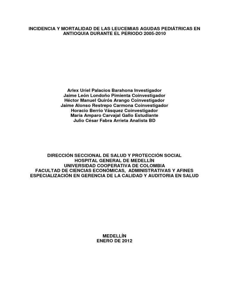 INCIDENCIA Y MORTALIDAD DE LAS LEUCEMIAS AGUDAS PEDIÁTRICAS EN ANTIOQUIA DURANTE EL PERIODO 2005-2010 Arlex Uriel Palacios Barahona Investigador Jaime León Londoño Pimienta Coinvestigador Héctor Manuel Quirós Arango Coinvestigador Jaime Alonso Restrepo Carmona Coinvestigador Horacio Berrio Vásquez Coinvestigador María Amparo Carvajal Gallo Estudiante Julio César Fabra Arrieta Analista BD DIRECCIÓN SECCIONAL DE SALUD Y PROTECCIÓN SOCIAL HOSPITAL GENERAL DE MEDELLÍN UNIVERSIDAD COOPERATIVA DE COLOMBIA FACULTAD DE CIENCIAS ECONÓMICAS, ADMINISTRATIVAS Y AFINES ESPECIALIZACIÓN EN GERENCIA DE LA CALIDAD Y AUDITORIA EN SALUD MEDELLÍN ENERO DE 2012