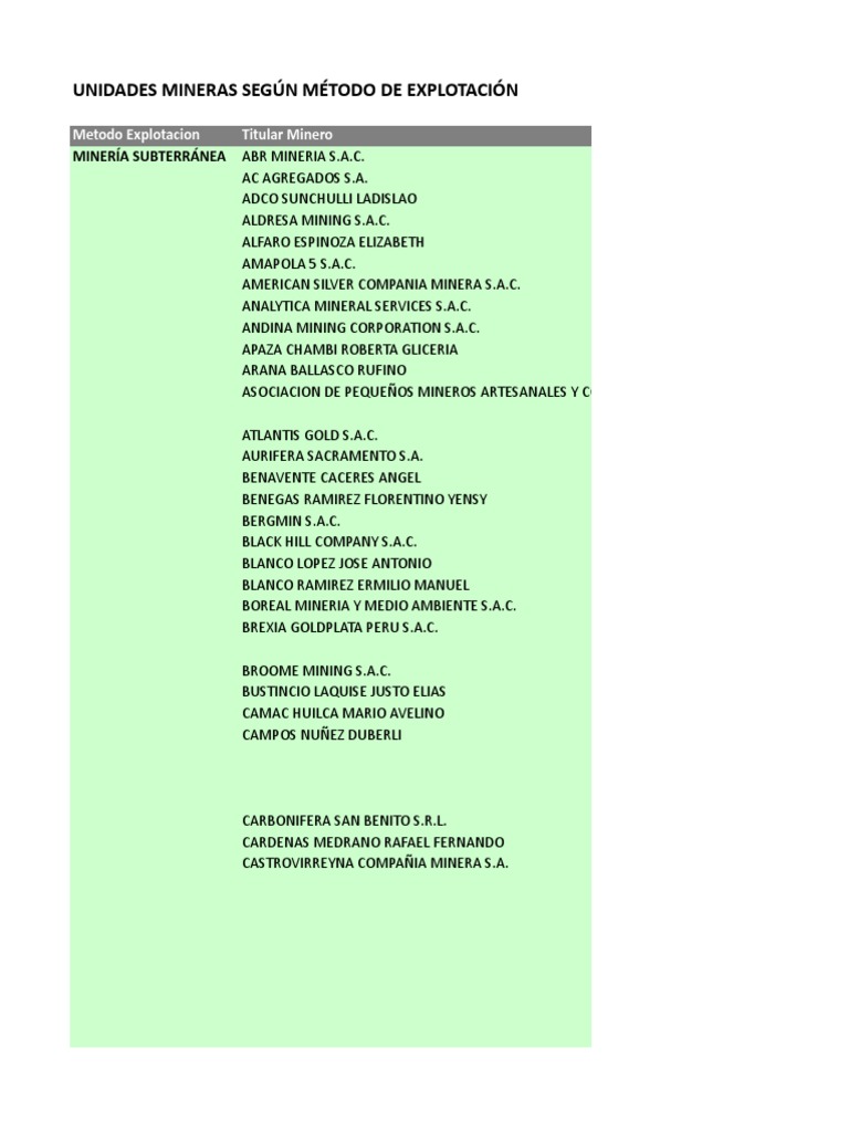 UNIDADES MINERAS SEGÚN MÉTODO DE EXPLOTACIÓN