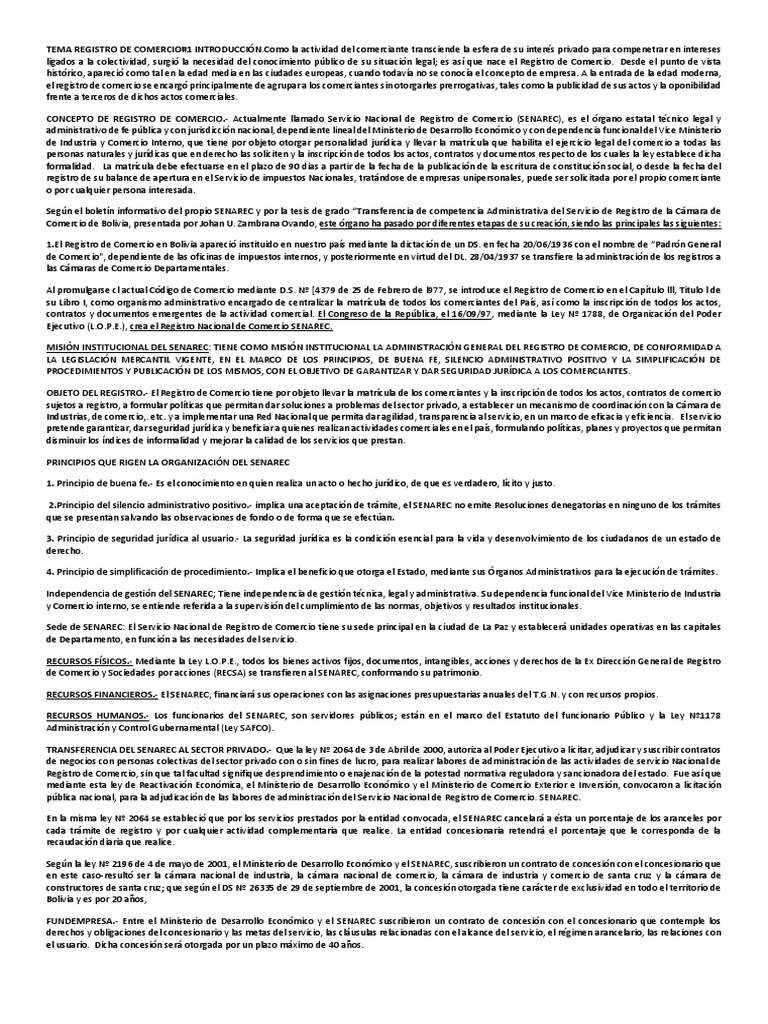 CONCEPTO DE REGISTRO DE COMERCIO.- Actualmente llamado Servicio Nacional de Registro de Comercio (SENAREC), es el órgano estatal técnico legal y