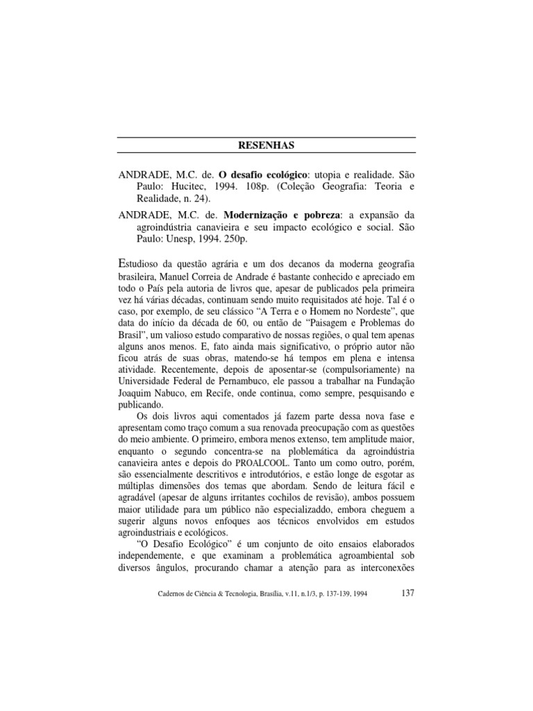 ANDRADE, M.C. de. O desafio ecológico: utopia e realidade. São