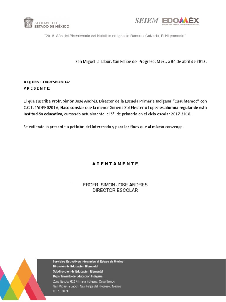 El que suscribe Profr. Simón José Andrés, Director de la Escuela Primaria Indígena “Cuauhtemoc” con