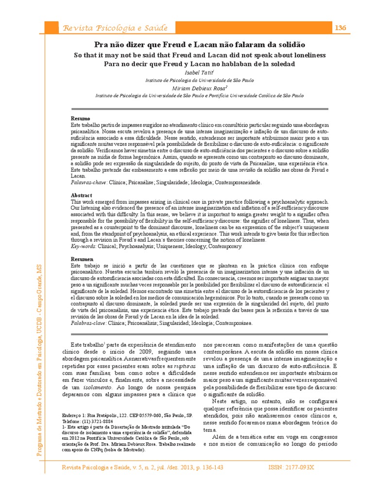 O compromisso com a ética psicanalítica nos leva considerada pela Psicanálise. Dessa forma, a solidão
