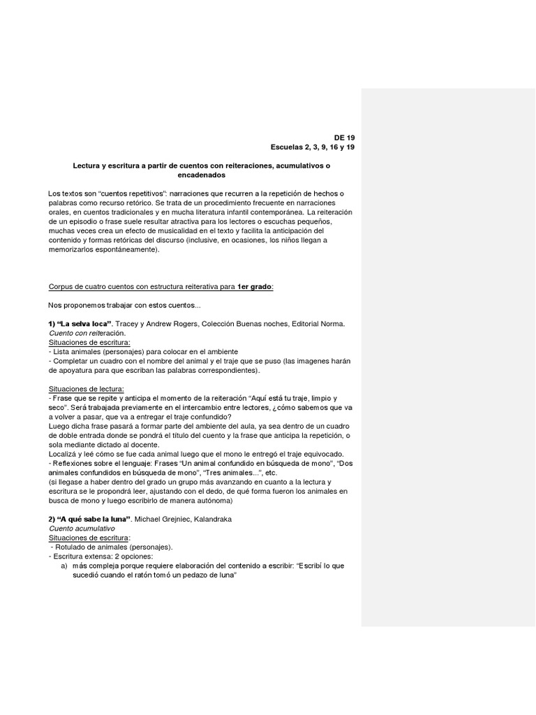 Lectura y Escritura A Partir de Cuentos Con Reiteraciones, Acumulativos o Encadenados
