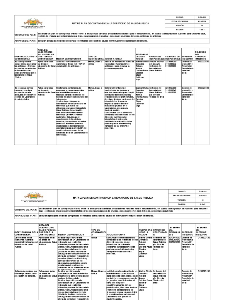 MATRIZ PLAN DE CONTINGENCIA LABORATORIO DE SALUD PUBLICA