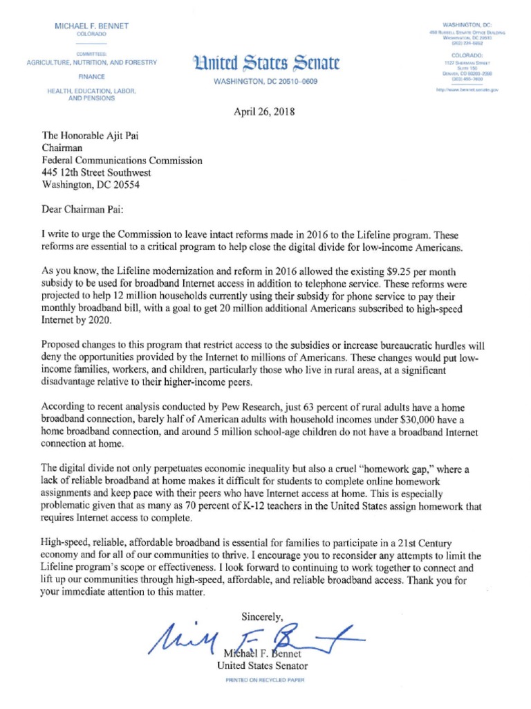 Colorado U.S. Senator Michael Bennet sent a letter to Federal Communications Commission (FCC) Chairman Ajit Pai urging him to leave intact 2016 reforms that modernized the Lifeline program b…Descripción completa