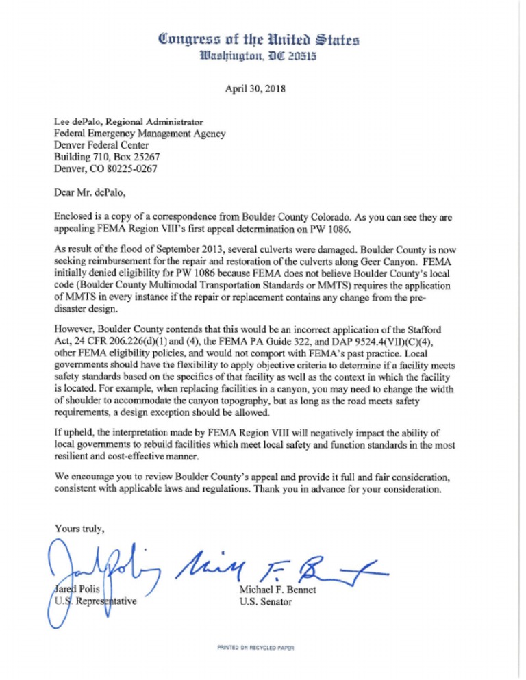 Colorado U.S. Senator Michael Bennet and U.S. Representative Jared Polis sent a letter to Regional FEMA Administrator Lee dePalo, supporting Boulder County’s request to update regulations th…Descripción completa