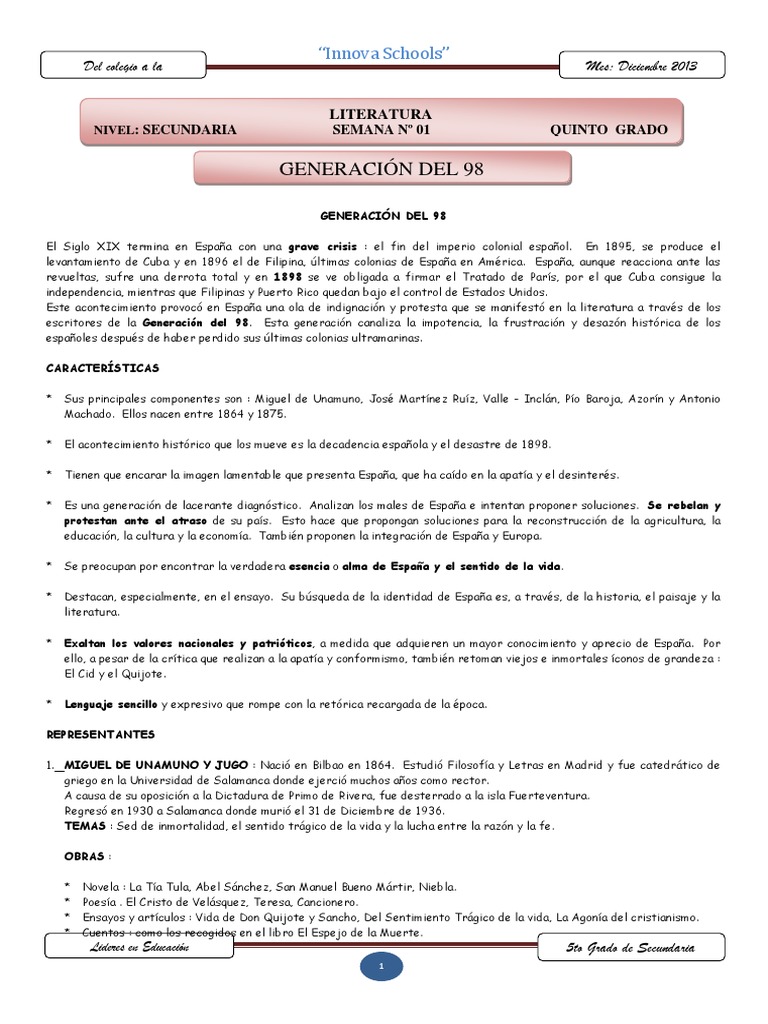 escritores de la Generación del 98. Esta generación canaliza la impotencia, la frustración y desazón histórica de los