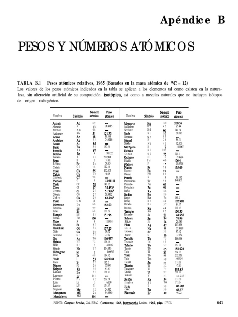 TABLA B.l Pesos atómicos relativos, 1965 (Basados en la masa atómica de l*C = 12)