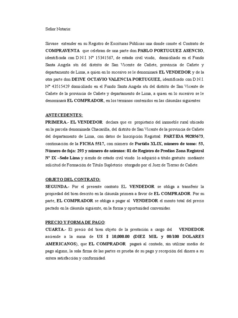 Sírvase extender en su Registro de Escrituras Públicas una donde conste el Contrato de