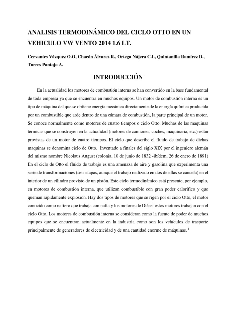 Realizar un análisis termodinámico del Ciclo Otto Teórico del motor de un VW Vento 2014