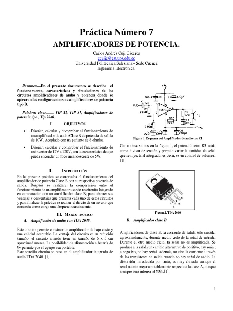 audio TDA 2040. [1] de los transistores de salida cuando no hay señal de audio. La