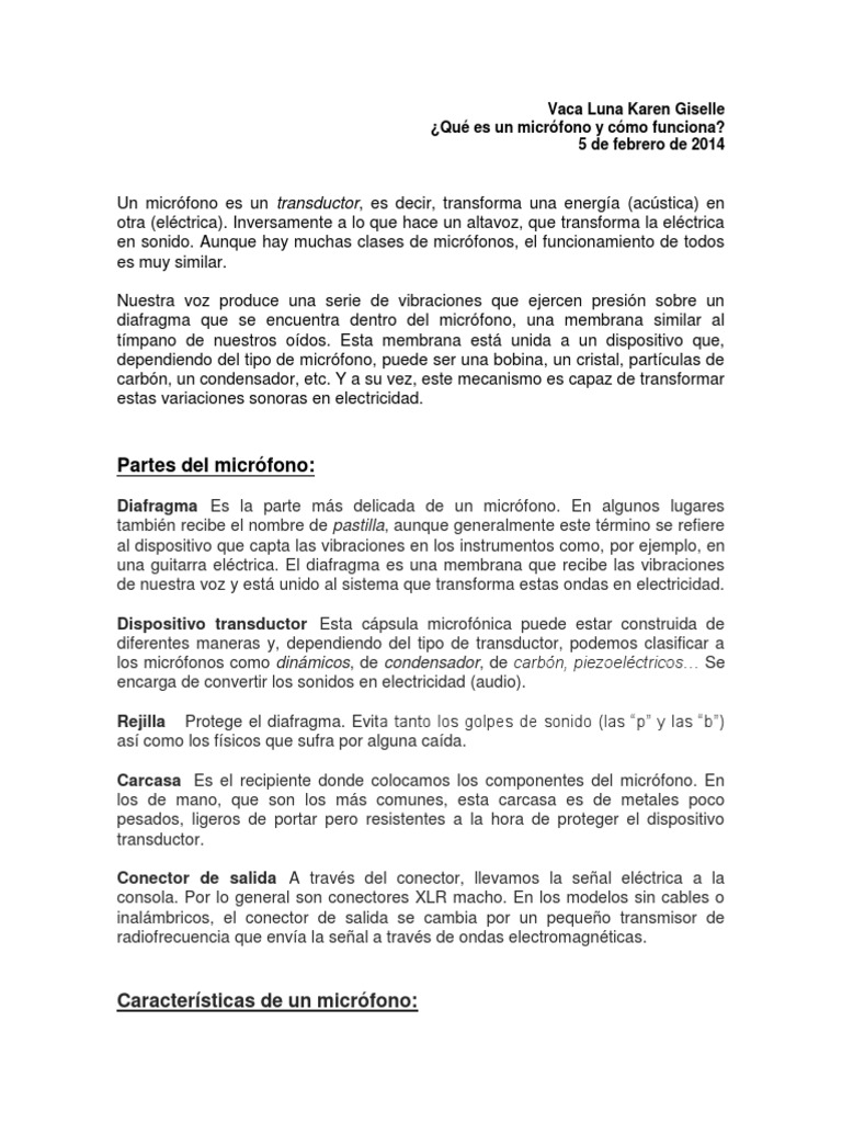 en sonido. Aunque hay muchas clases de micrófonos, el funcionamiento de todos