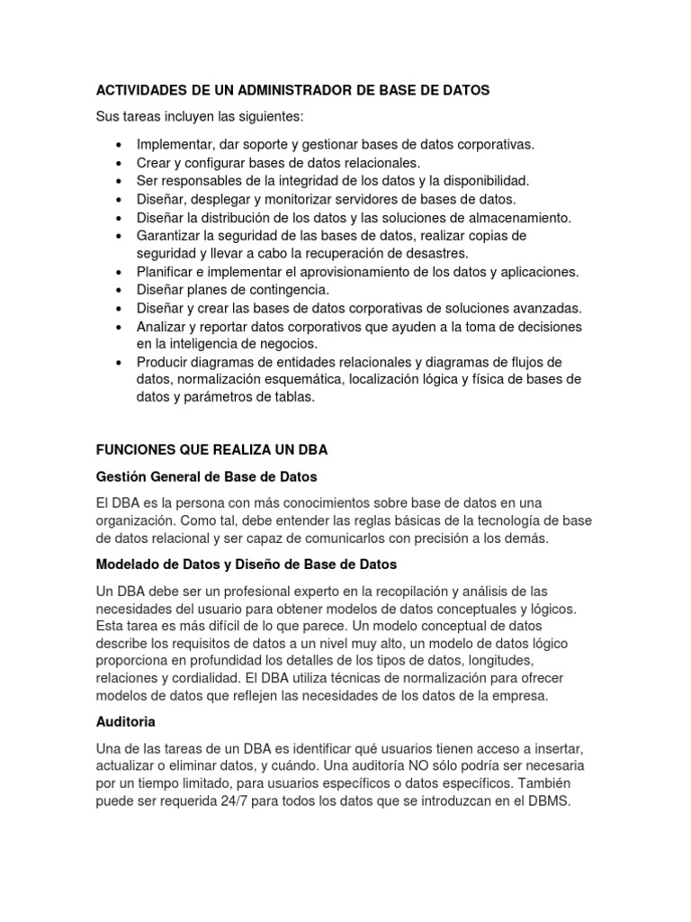 ACTIVIDADES DE UN ADMINISTRADOR DE BASE DE DATOS