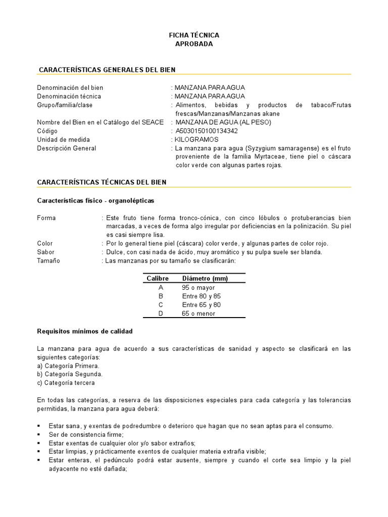 Requisitos de sanidad, aspectos y tolerancias respectivas para la manzana para agua