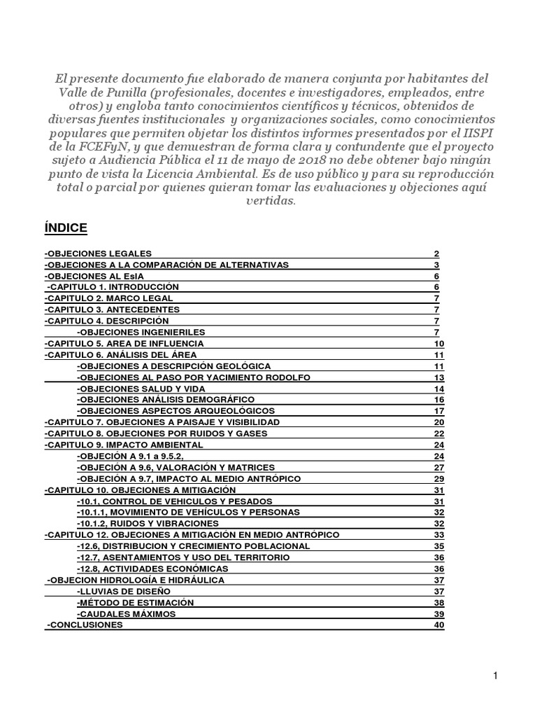 de la FCEFyN, y que demuestran de forma clara y contundente que el proyecto sujeto a Audiencia Pública el 11 de mayo de 2018 no debe obtener bajo ningún punto de vista la Licencia Ambiental. Es de uso público y para su reproducción total o parcial por quienes quieran tomar las evaluaciones y objeciones aquí vertidas.