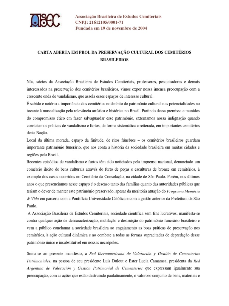 A Associação Brasileira de Estudos Cemiteriais, sociedade científica sem fins lucrativos, manifesta-se