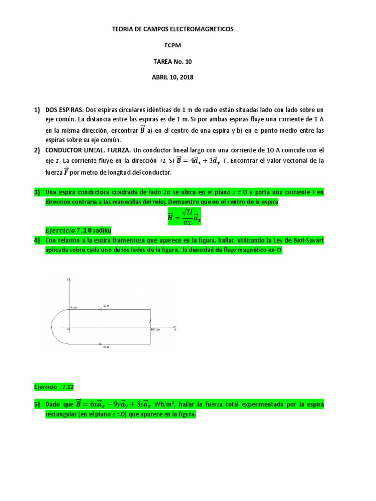 8) Una corriente filamentaria de 10 A se dirige del infinito hasta el origen, sobre el eje x positivo, y luego
