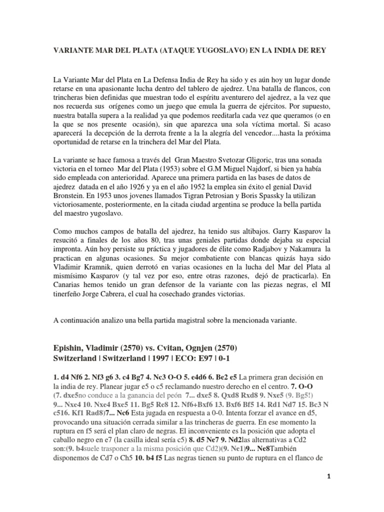 La Variante Mar del Plata en La Defensa India de Rey ha sido y es aún hoy un lugar donde
