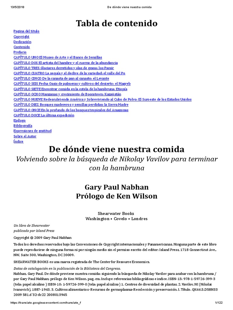 Nabhan, Gary Paul. De dó nde proviene nuestra comida: siguiendo la bú squeda de Nikolay Vavilov para acabar con la hambruna /