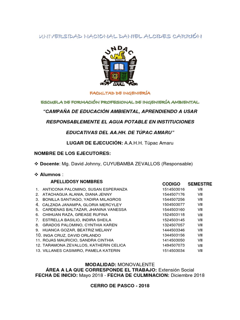 FECHA DE INICIO: Mayo 2018 - FECHA DE CULMINACION: Diciembre 2018