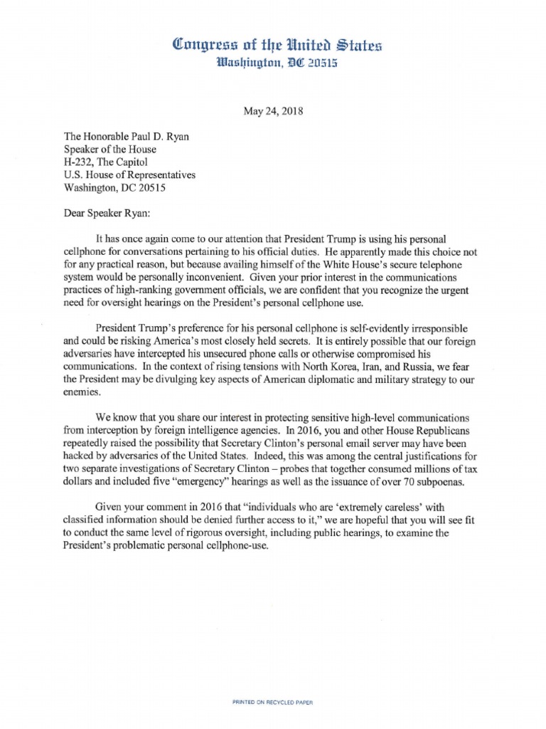 Democrats Request Hearings on President Trump’s use of his Unsecured Personal Cellphone