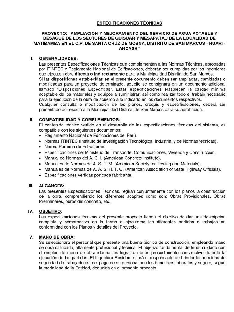 Las presentes Especificaciones Técnicas que complementan a las Normas Técnicas, aprobadas