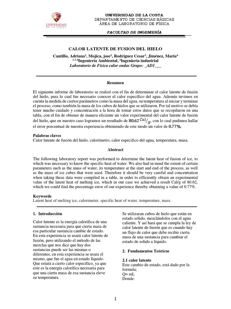 El siguiente informe de laboratorio se realizó con el fin de determinar el calor latente de fusión