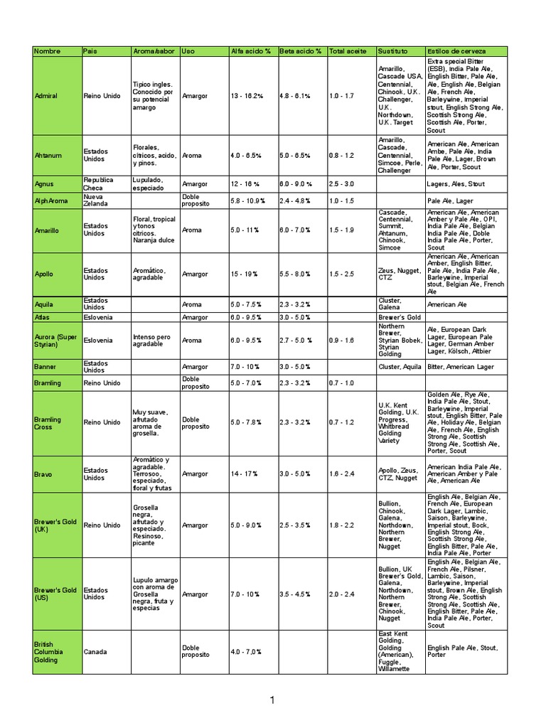 Nombre Pais Aroma/sabor Uso Alfa acido % Beta acido % Total aceite Sustituto Estilos de cerveza