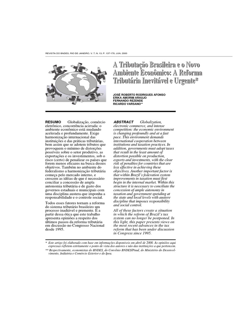 AFONSO, J. R. R. et alii. Tributação no Brasil: características marcantes e diretrizes para a reforma. Revista do BNDES, Rio de Janeiro, v. 5, n. 9, p. 25-50, jun. 1998.