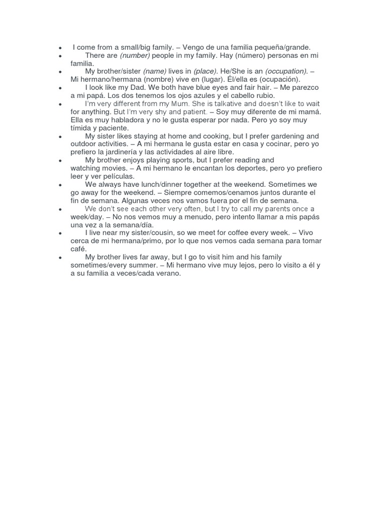 I come from a small/big family. – Vengo de una familia pequeña/grande.