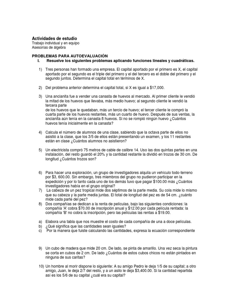 I. Resuelve los siguientes problemas aplicando funciones lineales y cuadráticas.