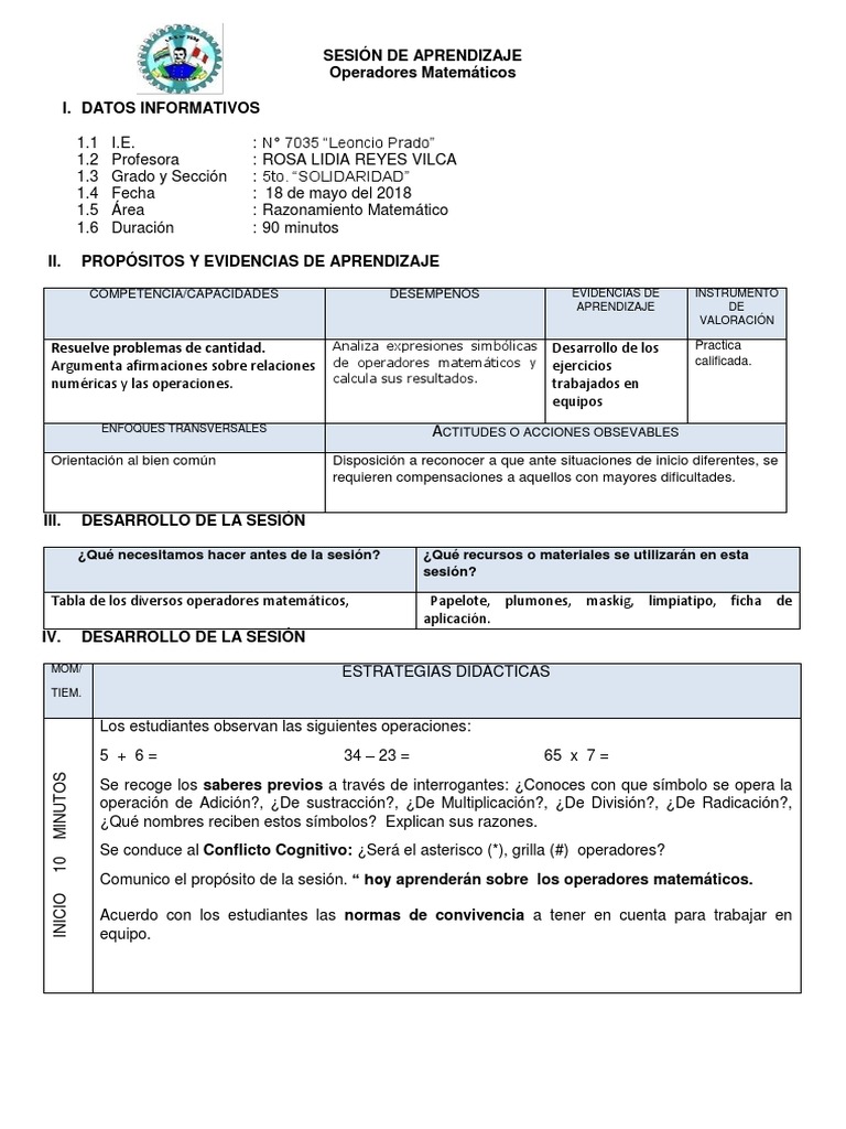 Comunico el propósito de la sesión. “ hoy aprenderán sobre los operadores matemáticos.