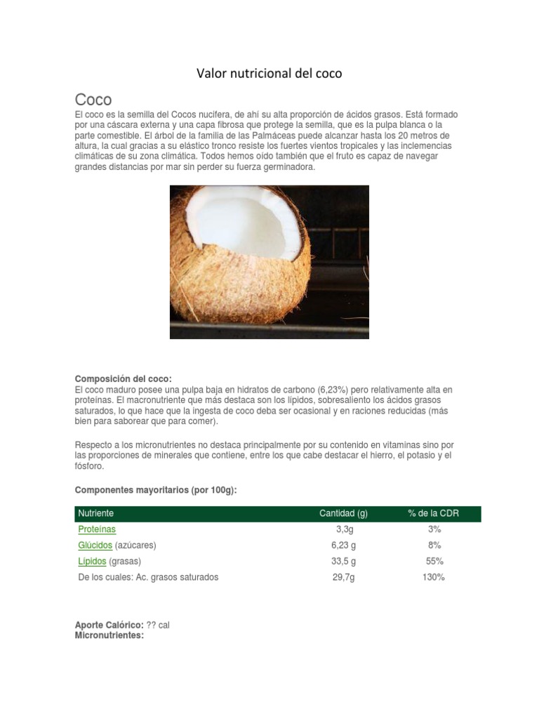 saturados, lo que hace que la ingesta de coco deba ser ocasional y en raciones reducidas (más