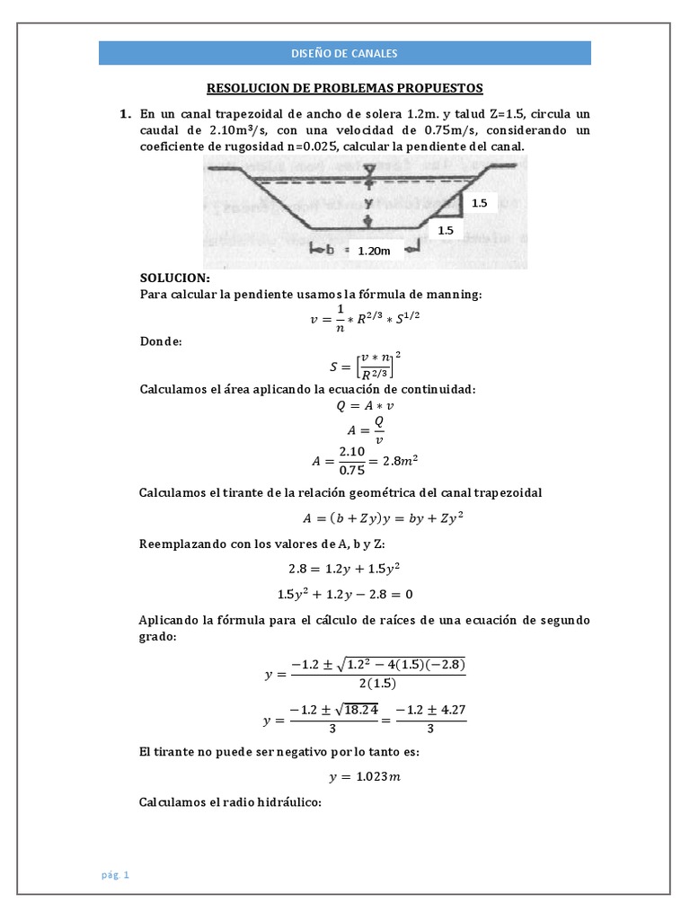 1. En un canal trapezoidal de ancho de solera 1.2m. y talud Z=1.5, circula un