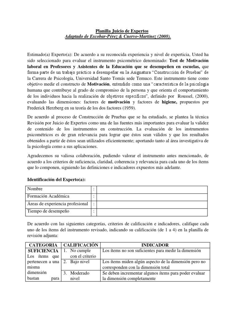 sido seleccionado para evaluar el instrumento psicométrico denominado: Test de Motivación