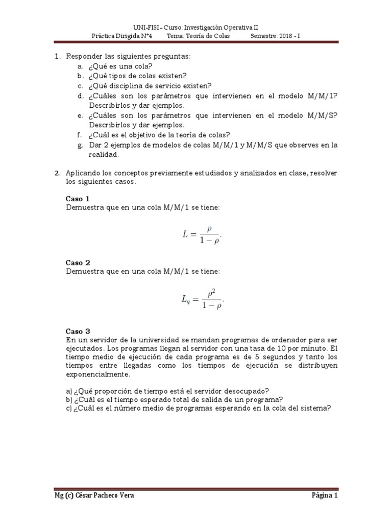 Práctica Dirigida N°4 Tema: Teoría de Colas Semestre: 2018 - I